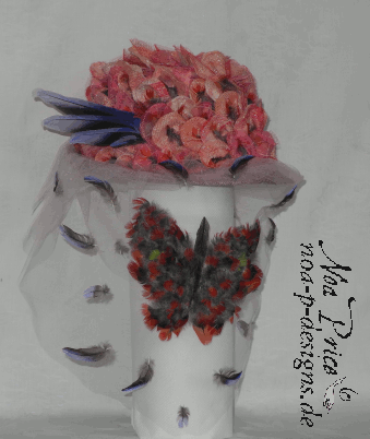 "Air travelled, light and delicate butterflies and feathers travel across the air carried by the winds. They are the essence of light weight that is also fascinating as far as their construction patterns and colours. They can be collected and captured, and sent from one person to another, by air mail, when people live away from another. People also travel by air in a great birds that mimic the feathers that crossed the winds since the beginning of time. The hat arrives from overseas, is made into and covered in light butterflies and feathers, it has a Reproduced stamp, completely air travelled."